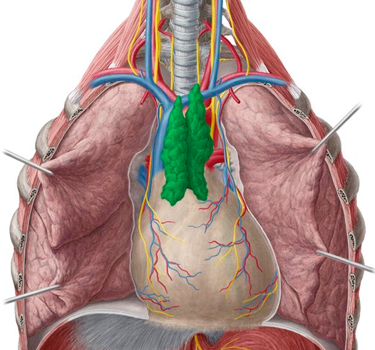 The thymus gland lies in the chest, directly behind the breastbone (sternum), and in front of the heart in the area between the lungs called the anterior mediastinum.