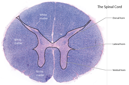 The spinal cord consists of a peripheral portion of white matter dominated by fibers, a central portion of grey matter dominated by neurons surrounding the central canal.