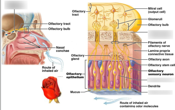 | Olfactory cells | Olfactory receptor cells (sense odor and contain cilia), supporting cells, basal (stem) cells (replacing old and damaged olfactory receptor cells). |