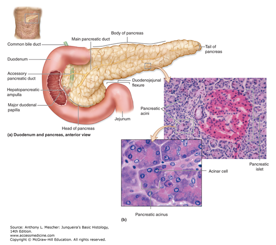 Exocrine secretions from acini flow successively through intercalated ducts, intralobular ducts, interlobular ducts and finally into the duodenum through the main pancreatic duct.