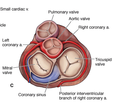 The right and left coronaryarteries arise from the aorta at the aortic sinuses, the pockets formed by the right and left cusps of the aortic valve, respectively.