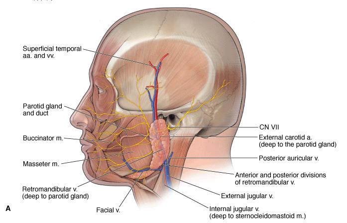 The parotid gland is situated in the lateral part of the face on the surface of the masseter muscle, anterior to the sternocleidomastoid muscle. A dense fascia covers the gland. The parotid gland produces and secretes saliva into the oral cavity and is innervated by visceral motor parasympathetic fibers from the glossopharyngeal nerve (CN IX).