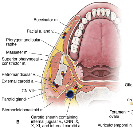 A. Topography of the parotid gland. B. Horizontal section through the parotid gland. C. Glossopharyngeal nerve (CN IX) and its innervation of the parotid gland.