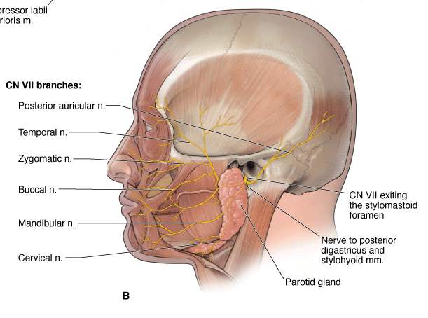 - Motor branches of CN VII. CN VII exits the stylomastoid foramen, enters the posterior surface of the parotid gland, and courses through the gland en route to innervate the muscles of facial expression. CN VII also provides visceral motor innervation to all glands of the head, with the only exception being the parotid gland, the gland that you would think CN VII would innervate (Figure 20-3A and B).