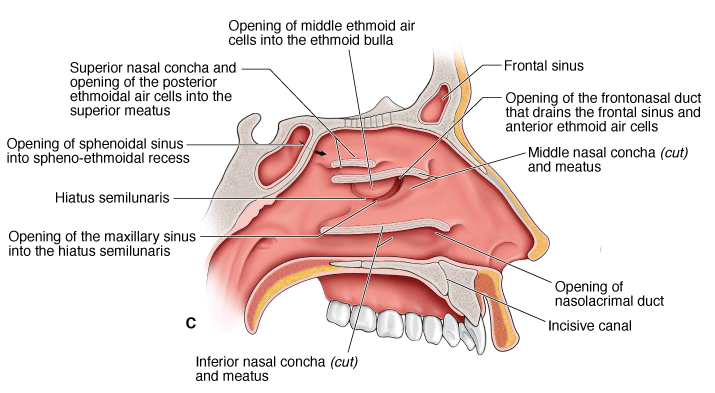 • The maxillary, frontal, anterior, and posterior ethmoidal sinuses open into the middle nasal meatus.