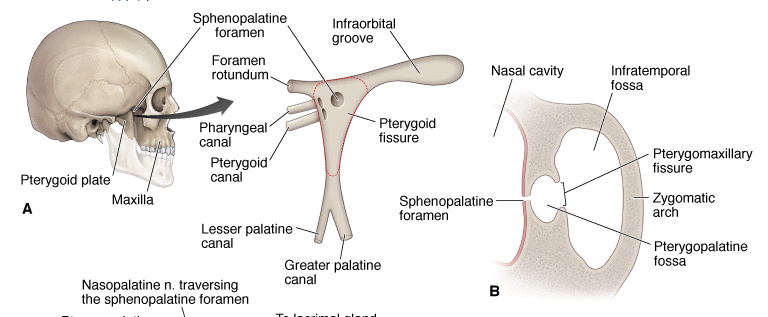 The pterygopalatine fossa is an irregular space where neurovascular structures course through to the nasal cavity, palate, pharynx, orbit and face (Figure 22-1A and B). The neurovascular structures enter and exit the fossa through the following boundaries: