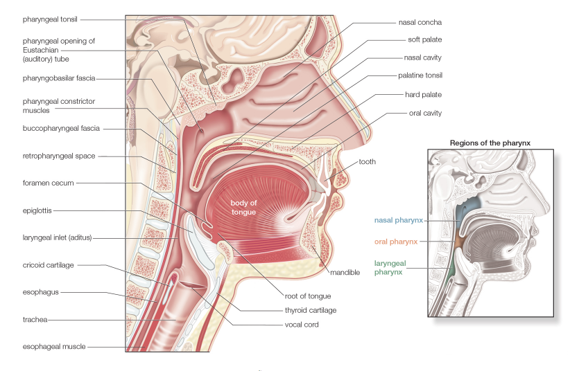 The nasopharynx is posterior to the nasal cavity, inferior to the sphenoid bone, and superior to the soft palate. During swallowing, the soft palate elevates and the pharyngeal wall contracts anteriorly to form a seal, preventing food from refluxing into the nasopharynx and nose. When we laugh, this sealing action can fail, and fluids that are being swallowed while we laugh can end up in the nasal cavity.