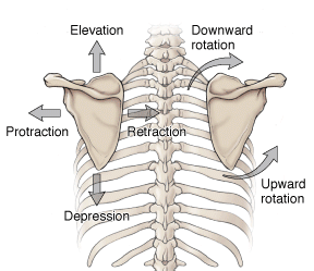 The scapula glides over the thoracic wall, but there are no distinct anatomic joints). Instead, muscles pull the scapula forward and backward (protraction and retraction, respectively) and up and down (elevation and depression, respectively) and rotate it so that the glenoid fossa moves superiorly (upward rotation) or inferiorly (downward rotation). Rotation of the scapula is defined by the direction that the glenoid fossa faces.