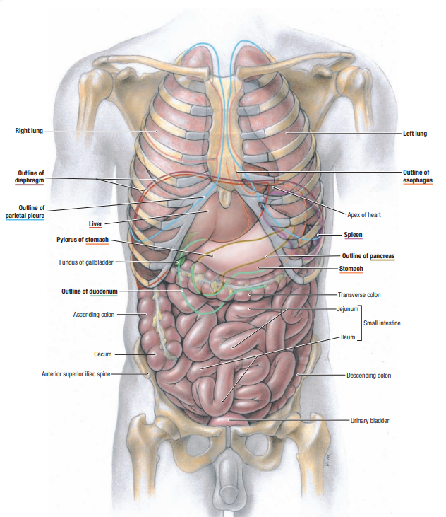 The falciform ligament (with the round ligament of the liver, the adult remnant of the umbilical vein, in its free margin) is reflected onto the anterior abdominal wall and divides the liver into apparent right and left anatomical lobes.
