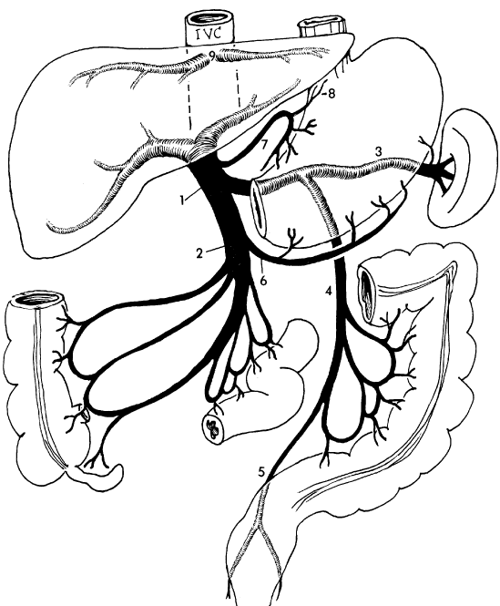 The portal system: 1 = portal vein, 2 = superior mesenteric vein, 3 = splenic vein, 4 = inferior mesenteric vein, 5 = superior rectal vein, 6 = right gastroepiploic vein, 7 = left gastric vein, 8 = esophageal vein, 9 = hepatic veins.