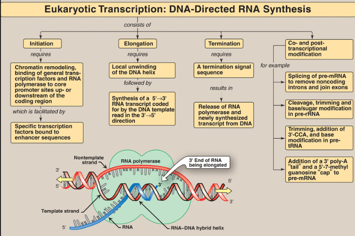 RNA polymerase moves along the DNA template strand, unwinding the DNA and synthesizing a single-stranded RNA molecule.