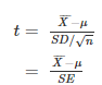 The formula for the t test has the observed mean minus the hypothesized value of the population mean (μ) in the numerator, and the standard error of the mean in the denominator. The symbol μ stands for the true mean in the population; it is the Greek letter mu, pronounced “mew.” The formula for the t test is